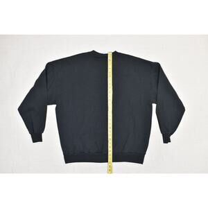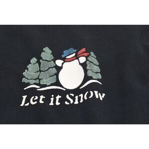 This is a vintage Jerzees 'Let It Snow' crewneck sweatshirt in a men's size 2XL. The black sweater features a festive graphic of a snowman wearing a blue hat and a red scarf, surrounded by green pine trees. The phrase 'Let it Snow' is printed below the snowman. The sweatshirt appears to be in good used condition with no visible stains, tears, or major damage. The fabric shows some signs of light wear and pilling, consistent with a vintage item. The measurements, as shown in the images, are approximately 28 inches from armpit to armpit and 27 inches from the top of the shoulder to the bottom hem. This sweater is perfect for the holiday season or for anyone who loves vintage holiday apparel. Made from a blend of materials, likely cotton and polyester, providing a comfortable and warm fit.
