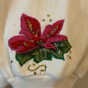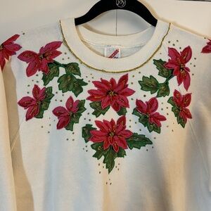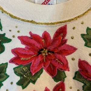Beautiful Grandma style Vintage Jerzees Glitter Poinsettia Sweatshirt. Each Poinsettia is handcrafted with a puffy paint material so it has a 3D effect with stunning gold accent. Gold dots surrounding these gorgeous Christmas florals so they glitter in from every angle. Even has gold trim around the collar and cute poinsettia on each wrist.
