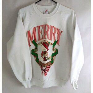 Vintage Jerzees Women's White Sweatshirt Merry Christmas Teddy Bear Design Large