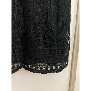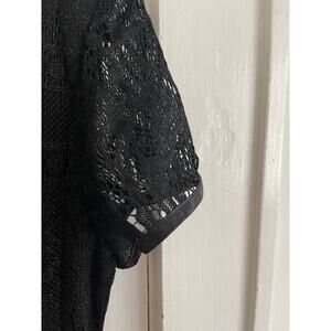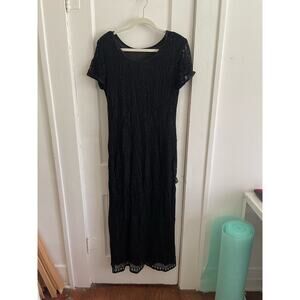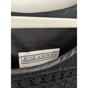 Beautiful Jessica Howard crochet dress in black fabric with gold specs. Slightly stretchy. Excellent used condition. Fully lined interior with see-through delicate sleeves and bottom of skirt un- lined. See pics.