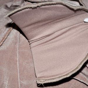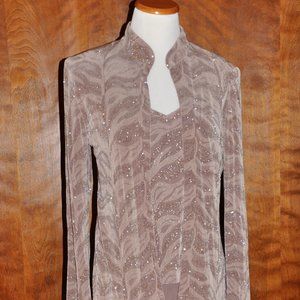 This is a lovely vintage Jessica Howard formal gown and jacket that are a fawn color with tiny gold, white and clear beads throughout the bodice on the dress and the entire jacket. The dress has spaghetti straps and the jacket has long sleeves as well as it's a stretchy fabric that is gorgeous, shimmery and comfortable. This would make a perfect Mother of the Bride gown but is very versatile and could be worn for almost any occasion.