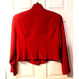 This Vintage Jessica Howard Women's Top in size L is a stunning piece made of red velvet with raised embroidery accents on the lapel and collar. The Edwardian style top features a high neckline, long sleeves with covered looped buttons closure, padded shoulders, and a classic/fitted sleeve design. Perfect for a party or casual occasion, this blouse exudes a boho vibe with its solid pattern and vintage charm. The brand's attention to detail and quality fabric make it a timeless addition to any woman's wardrobe.