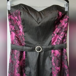 This elegant strapless dress features a stunning combination of black and pink, perfect for any special occasion. The sleek design is enhanced by a stylish belt detail, offering a flattering silhouette.