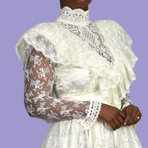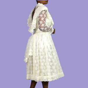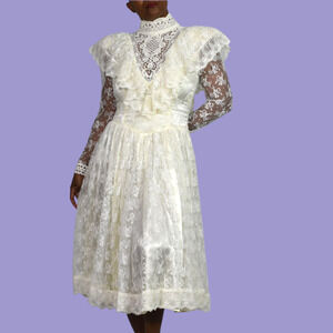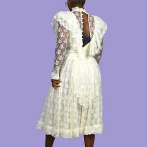 Vintage Jessica McClintock Bridal Dress Ivory White Lace Yoked Ruffle Midi Small