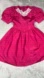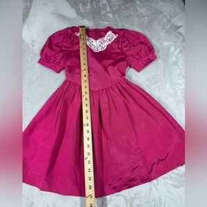 Fuchsia pink dress with lace collar and faux pearl beaded details, short puff sleeves, A line, bow details on sleeves. Tie back fabric bow, zippered back, unlined. Made in the USA. Formal, party, events, wedding guest, Barbiecore, girly, Barbie, birthday