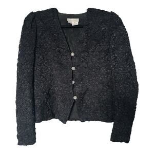 The Jessica McClintock Gunne Sax Formal Bolero Jacket in size 12 is a vintage piece from the 1980s, featuring intricate lace applique and rhinestone buttons The black blazer style jacket is perfect for formal occasions, exuding an elegant eveningwear look.