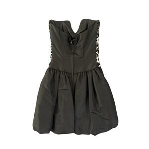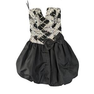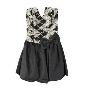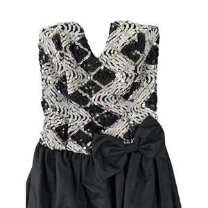 This stunning vintage-inspired homecoming or holiday party dress features a sweetheart neckline with a fully sequined corset bodice and a voluminous black bubble hem skirt finished with an oversized satin bow at the waist. The flattering fit accentuates curves while offering timeless glamour and sparkle. Perfect for homecoming, prom, New Year’s Eve, or any event where you want to make a statement. In excellent condition.