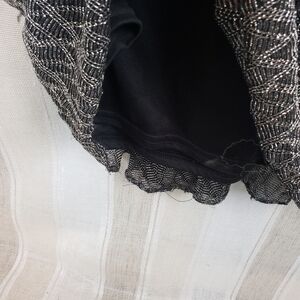Good condition, does have a fair amount of pulls in the tinsel (see photos) on front and back, shimmery floor length gown, fully lined, made in the USA, black with silver sparkles.