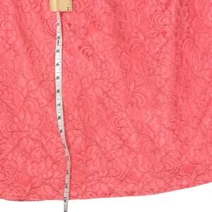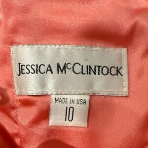 A stunning vintage 90s Jessica McClintock strapless mermaid gown in coral pink with delicate floral lace overlay. Features corset-style boning for structure, a bow-accented waist, and a fully lined interior for a smooth fit. Perfect for prom, weddings, or any formal occasion. Made in the USA.