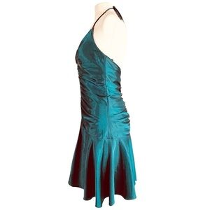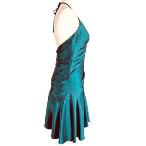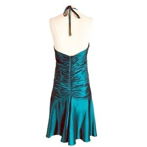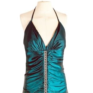 Features: 100% polyester satin fabric in teal. Sleeveless halter neckline. Opened back. Embellished and ruched detail front. Flutter bottom hemline. Zip closure.