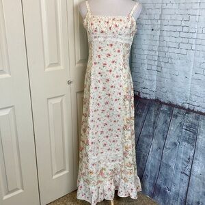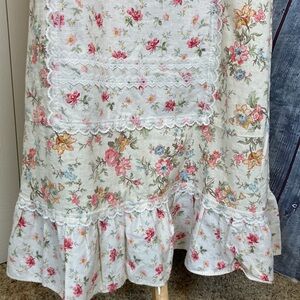 This dress is perfect for any occasion, whether it's a casual day out or a party/cocktail event. This is a maxi dress with a prairie-style hemline and is machine washable for easy care. The dress is a size 9/10. The dress is accented with lace and has a vintage feel, perfect for those who love the 70s and 80s cottagecore and prairie themes.
