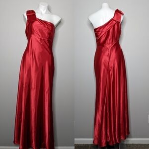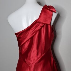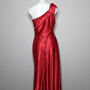 Vintage Jessica McClintock for Gunne Sax red satin maxi evening dress 11. One shoulder with a bow accent. Two small pulls and one small spot at the bottom, not visible with wear (see photos)