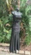 That’s pretty black satin gown is vintage Jessica McClintock. The satin spaghetti strap start off the dress that has a corset style boned bodice. Below the bodice is a ruched center with some large rosettes. The satin is clingy too about the knee and branches out into a mermaid fuller skirt. Lovely gown fully lined with boning through the bus line and in excellent condition