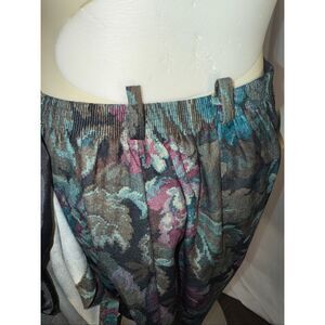 • Floral tapestry print in jewel tones (purple, teal, brown)