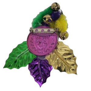 This Mardi Gras themed brooch with a jester face on it is the perfect accessory . It is a white jester face and has a Yellow Purple Green mask painted around the eyes with a Purple Rose hat, bells, Green Purple Gold Leafs and You will be the best dressed at any party or Mardi Gras event with this jester face brooch.