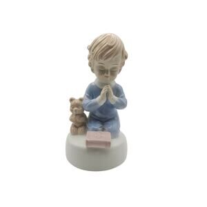 This vintage ceramic musical figurine features a young child kneeling in prayer beside a teddy bear, with a small Bible at the bedside. The base plays the beloved hymn “Jesus Loves Me” when wound, marked CMSS005 on the underside.