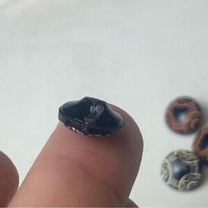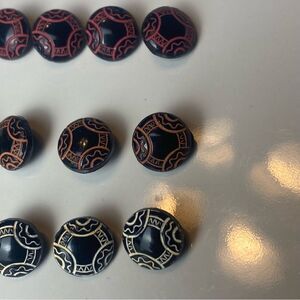 Vintage Jet Black Glass Etched and Painted Buttons. Excellent vintage condition. 18 jet black glass buttons. Etched and painted in art deco style. Cream, pink and orange. Measures appropriate 7/16" across.