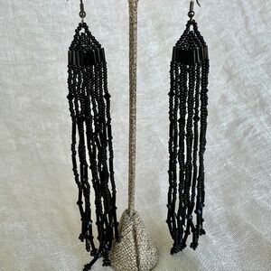 Vintage Jet Glass Beaded Shoulder Duster Earrings – 6″ Long – Sterling Hooks