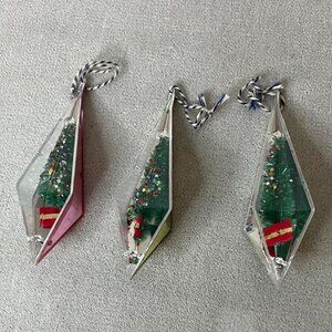 Vintage Jewel Brite diamond-faceted, glittered bottle-brush Christmas tree ornaments with a reflective back and a red present at the bottom. One ornament with a red back, one with a gold back, and one with a blue back. These ornaments will look gorgeous on the tree, reflecting light off the back and insides. They are in great condition, for their age