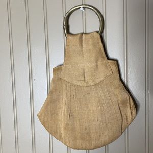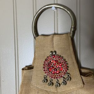 This is A beauty!!! Believe it's made out of Burlap or a feed bag. Possibly handmade. It's in decent condition. Does have some areas browner than others. Unsure of the type of stone also. It has a snap closure and also has a pocket inside.Go ahead and add this to your vintage collection.