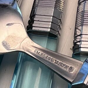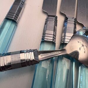 I also have another complete set listed that is in the darker blue color if interested. Do not put vintage flatware in the dishwasher!!!