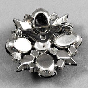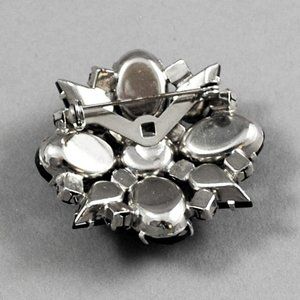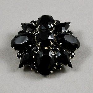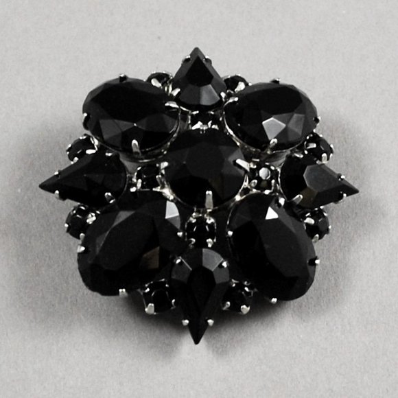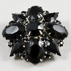 Vintage brooch with black beads set in a silver tone metal prong setting. Faceted stones in an oval and teardrop shapes with a round faceted stone in the center. Measures 1 3/4 inch diameter. With a domed shape, the pin has a solid metal backing.