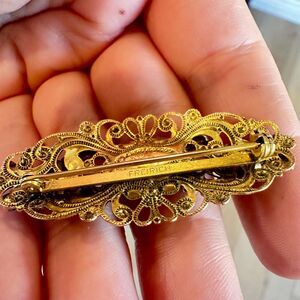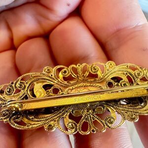Lovely Vintage Brooch, Gorgeous gold tone filigree Victorian French brooch by Freirich, signed