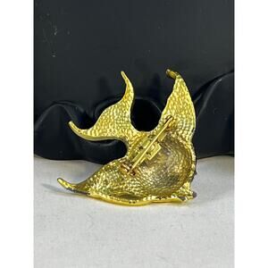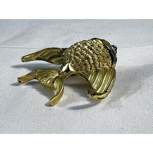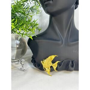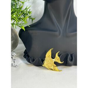 This vintage angelfish brooch features a graceful gold-tone finish with detailed texturing that captures the fluid elegance of the sea creature.