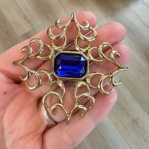 Amazing blue and gold tone brooch. I love the bold look of the blue crystal with the gold tone swirly design