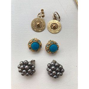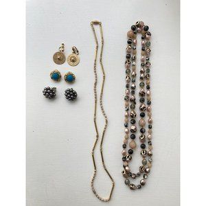 Vintage Jewelry Lot w 3 Sets Clip On Earrings & 2 Long Art Deco Beaded Necklaces