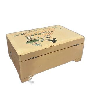 Vintage Hand-Painted Jewelry Box With Key Nonworking Wind-Up Music Box (metal music box itself needs repair - it looks like a simple fix but we have not attempted). The inside has fabric-lined compartments. There's also a cover for the music box portion. We believe this box is from the 1950-1970s. Key included.