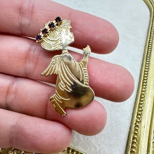 Gold tone angel brooch with purple rhinestones