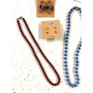This set includes elegant vintage-inspired pieces, featuring maroon and gray-blue hues. The earrings boast unique designs, while the beaded necklaces add an antique charm to your collection. A timeless selection for those who appreciate intricate craftsmanship and classic style.