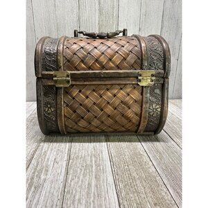 Vintage Jewelry Trinket Treasure Box Wood Wicker Rattan Hinged Lid w/ Top Handle