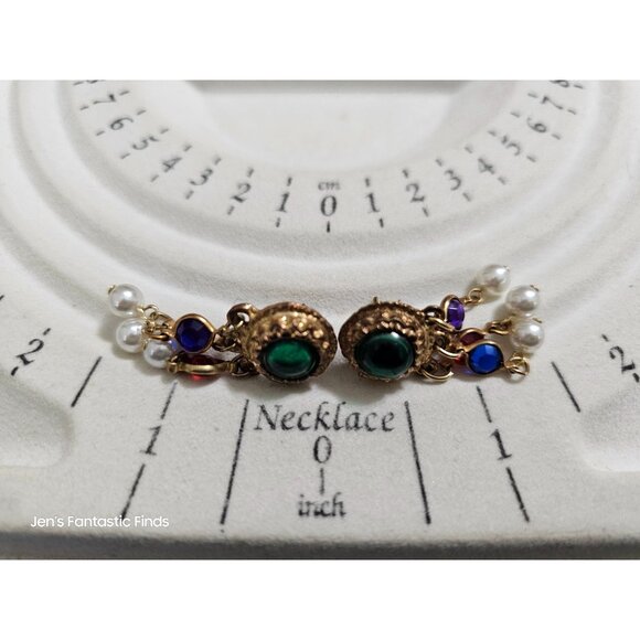 These elegant vintage clip-on earrings feature a striking design with green glass gems and lustrous pearl drops. A sophisticated choice for refined events, the gold-tone metal complements the vibrant colors. They add a touch of glamour and are easy to wear with their secure clip-on backings.