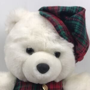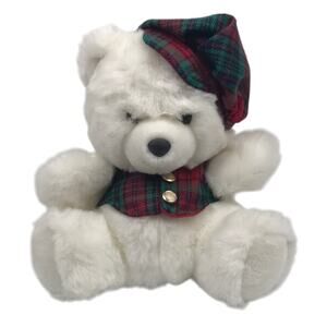 Vintage Jingle Bell Jr Hand Puppet Plush 12'' Christmas White Polar Bear Stuffed Animal with Plaid Cap and Vest Made Exclusively for Broadway