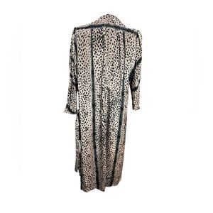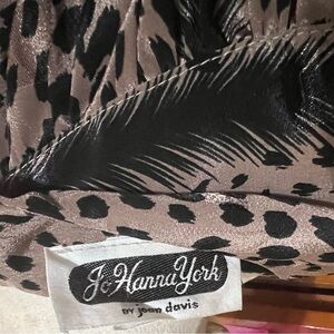 This vintage Jo Hanna York dress is a stunning addition to any wardrobe. The brown and black animal print satin fabric is both luxurious and playful, making it perfect for any occasion. The dress features a round neckline, 3/4 sleeves, and a zip closure.