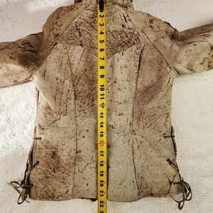 Vintage 70s Western jacket by Jo-O-Kay. This jacket is in great vintage condition. It has fashionable ties on each side. The leather is dual shades. The inside is lined with faux fur. Please keep in mind that vintage items often run smaller than modern pieces. See photos for approximate measurements. I found one imperfection in the leather on one of the sleeves. Shown in the last photo. Please see all photos before purchasing. This jacket can only be cleaned by a professional leather cleaner and could probably use a good cleaning considering its age.