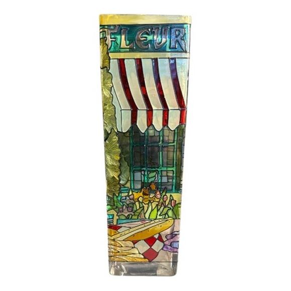 Excellent vintage preowned condition. This is a handmade designed by Joan Baker stained glass, rectangular vase, called French Café. The vase has incredible detailing that shows four sides of a beautiful French scene. One side shows a gate with a lamp and a basket of bread that goes to the next side with flowers and a red and white striped canopy. The word. “Fleurs” is at the top. two other sides show a table with a bottle and two glasses of red wine. This is an adorable unique piece for any decor that you and your guest will enjoy. 10 inches tall and 3“ x 3“.