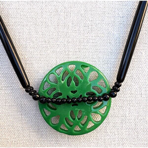 Vintage Joan Rivers Acrylic Lucite Cutout Green & Black Necklace Unique Rare 36"