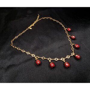 The necklace features a gold-tone link chain accented with five dangling enamel ladybugs, each shimmering in deep red enamel with black and gold detailing. The charming ladybugs are suspended from an elegant circular-link chain, creating graceful movement and a touch of whimsy.