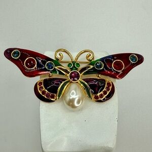 This exquisite vintage brooch from the Joan Rivers Classics Collection features a colorful plique-à-jour enamel butterfly design with vibrant red, green, blue, and purple translucent wings. Accented with multi-color rhinestones and a luminous teardrop-shaped faux pearl as the butterfly’s body, the piece is framed in a gold-tone finish. The intricate filigree-style reverse bears the Joan Rivers signature stamp.