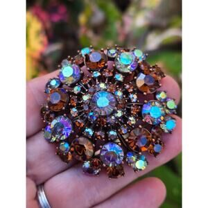 Vintage Joan Rivers Topaz Aurora Borealis Round Domed Rhinestone Brooch, 2"