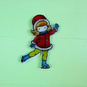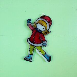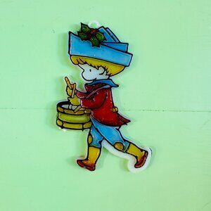 Set of three Joan Walsh Anglund Christmas ornaments featuring her cute boy and girl characters. This trio is plastic "stained glass" style. They measure approx 2.75" long and are in good vintage condition. The Christmas tree ornament has a bit of red glitter loss.