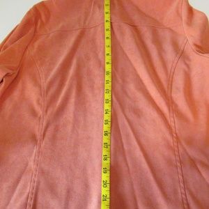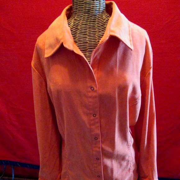 Vintage Joanna Petite Woman's button up style long sleeve, snap closure front top and matching cuffs, yoke back, decorative stitch down back sides, stretch, fitted style; peach color polyester blend