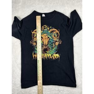 This Vintage Job For A Cowboy T-Shirt in small size and black color is a rare find from the 2000s metalcore band era. Made of cotton material and featuring a graphic print of the band, this short sleeve t-shirt with a crew neckline offers a regular fit for men. Manufactured by Hanes in El Salvador, this t-shirt is a collector's item for fans of the band and those interested in unique 2000s fashion.