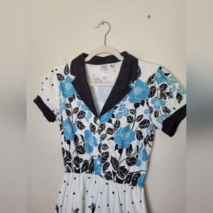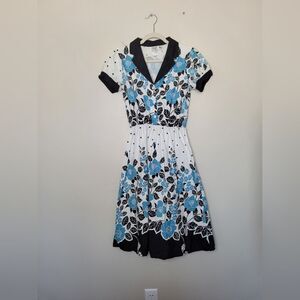 Super cute vintage Floral dress by Jodi. Made in USA. Perfect for the time period of 1950s. Retro, rockabilly, Americana. Blue, white and black floral print with a collared and button up bodice. 100% cotton material. Lightweight and lovely. Great condition, one small spot shown in photo. Tagged size small. measures approximately 42 inches long 16 inches underarm to underarm laid flat 24 inch waist.