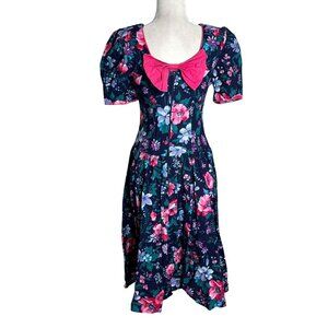 Vintage Jodi Michaels Floral Fit Flare Dress Small Navy Pockets Bow Zipper