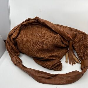 Very very gently used.. Jodi Stuart for Jill Stuart. This is a fabulous light weight carry all bag, Fully lined pristine interior , one interior zippered pocket, Zipper closure top. Dark Natural Saddle color. Pressed glovesoft leather in faux skin pattern, cut in triangular soft shoulder/crossbody bag. approx 24" along top X 19" at bottom point. Holds a ton.. approx 15" Depth totally stuffed. Knotted Shoulder strap 2 1/2" Wide x 20" knot to knot. The bag is in superb condition. Sold without dust cover