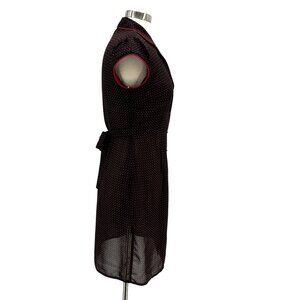 Lightweight short sleeve collared sheath dress - black with a red polka dot pattern. Made of a semi-sheer fabric. Buttons down the front. Short / knee length. Attached tie on the back. Short cap sleeves. 100% Polyester. Made in the USA.